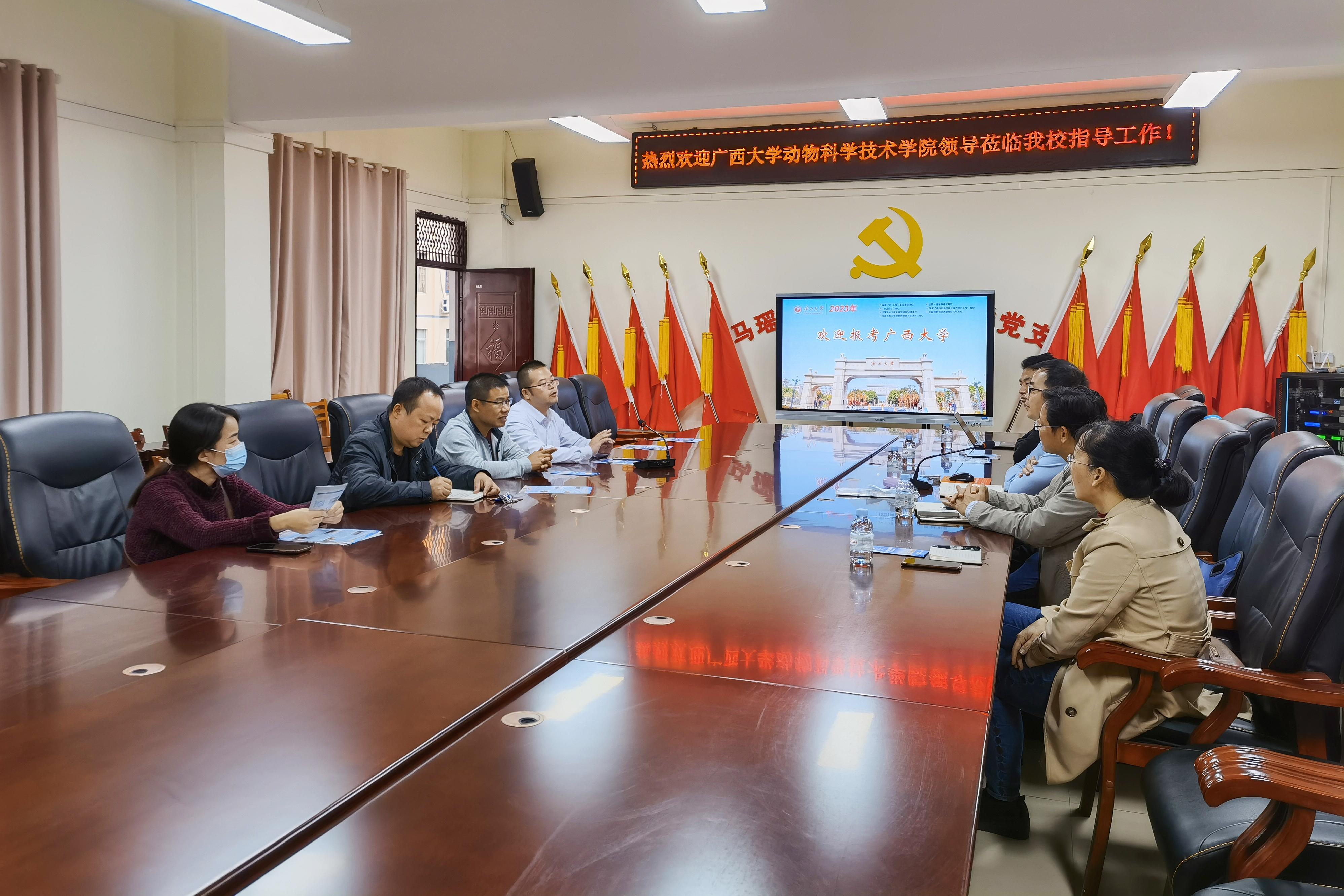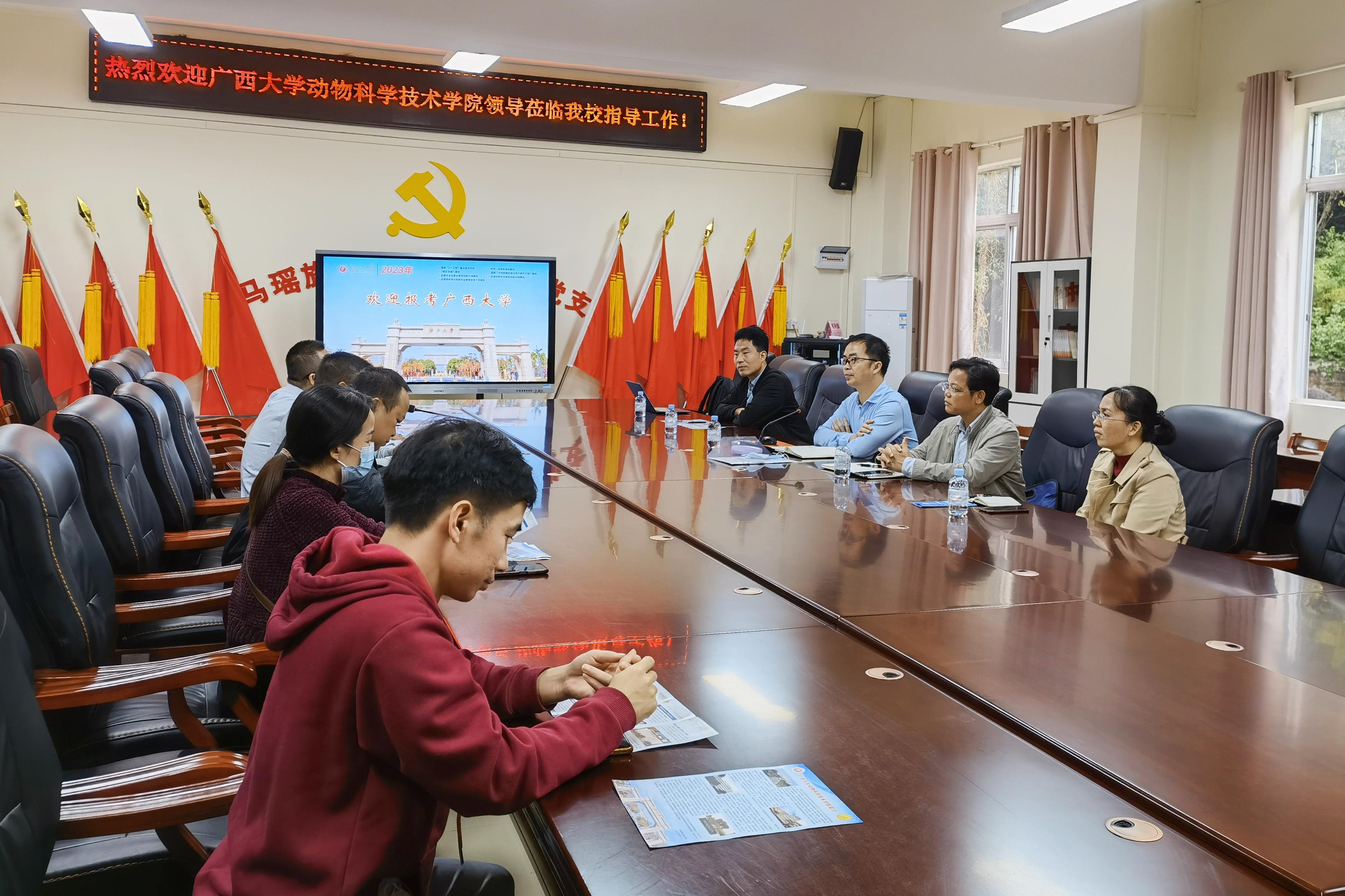 为进一步加大公司招生宣传力度,加强与区内优质中学的沟通联系,11月24日至25日,beat365常务副经理陆阳清,副经理何家康,动物医学系主任陈樱,动物科学系副主任李辉,团委副书记刘诚先后走访都安瑶族自治县高级中学、巴马瑶族自治县高级中学、凤山县高级中学等3所自治区示范性普通高中。