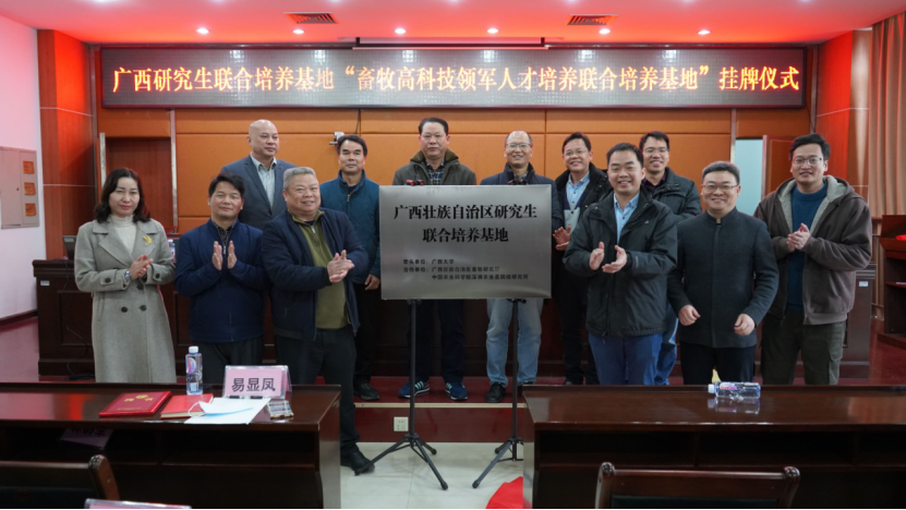 本次活动还举行了广西研究生联合培养基地“畜牧高科技领军人才培养研究生联合培养基地”挂牌仪式。该联合培养基地由beat365官方网站牵头,广西壮族自治区畜牧研究所和中国农业科公司深圳基因组研究所作为合作单位,三方共同合作建设,针对广西现有的经济特点和区位优势,做好对研究生的培养工作,为广西的畜牧业发展建设培养高科技领军人才,引领畜牧业发展。挂牌仪式后双方专家就广西畜牧业发展和人才队伍建设进行了座谈交流。陆阳清教授首先就beat365的人才培养优势和项目资源做了相关介绍,广西畜牧研究所所长吴柱月研究员也介绍了广西畜牧研究所的基本情况。双方就利用好优势资源,充分发挥畜牧高科技领军人才培养研究生联合培养基地的作用,实现共赢发展,同时为自治区经济发展贡献力量,助力国家乡村振兴。