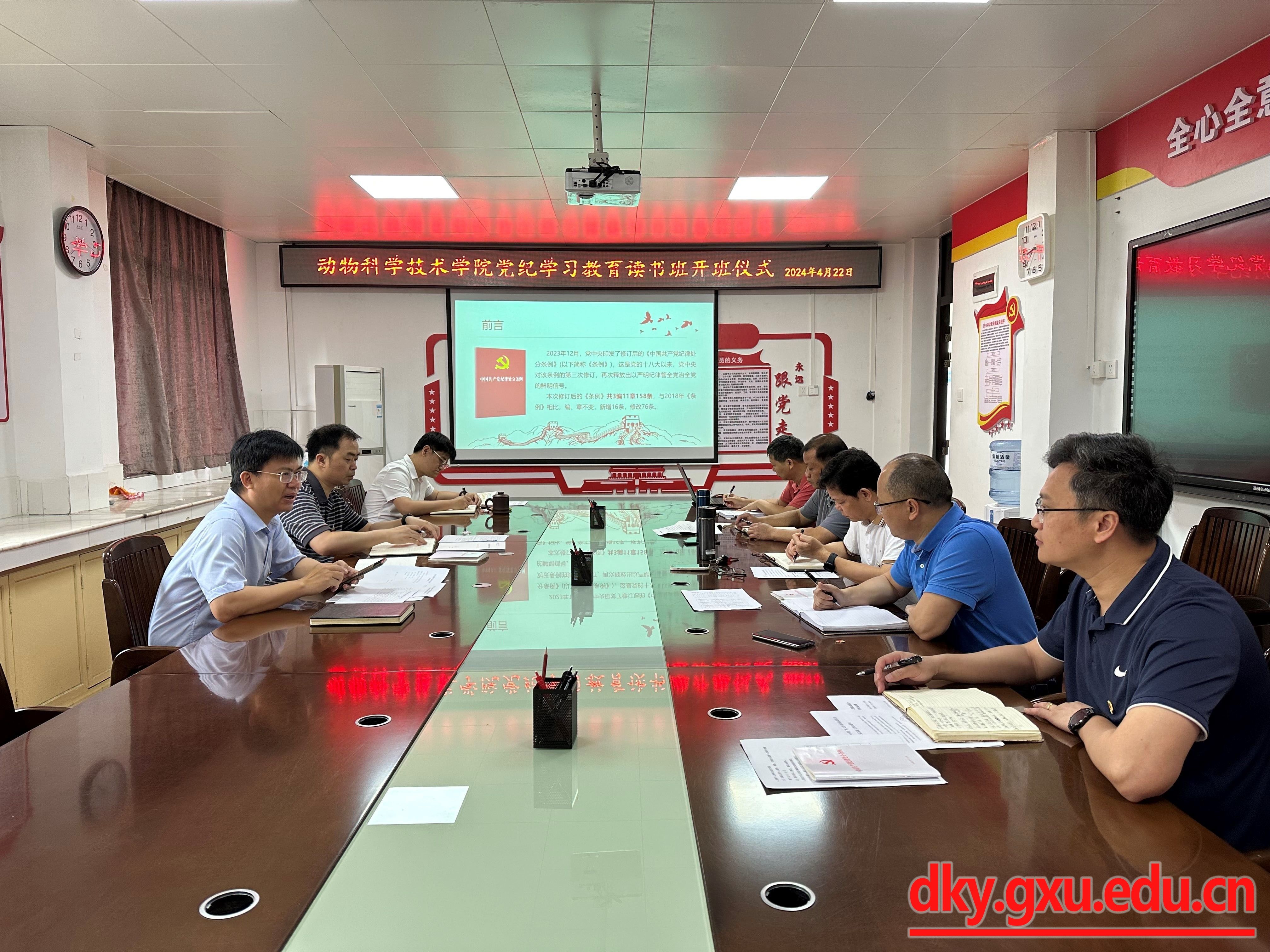 根据中央、自治区、beat365官方网站党委关于党纪学习教育的部署要求,4月22日上午,公司召开党纪学习教育读书班开班仪式。动物科学技术公司党委书记韦小强主持开班仪式,并进行新修订的《中国共产党纪律处分条例》(以下简称《条例》)专题辅导报告。