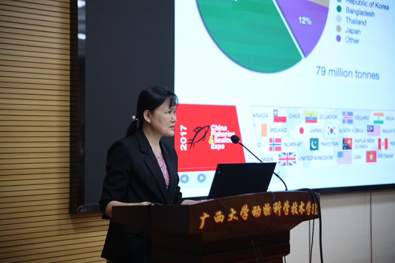 首先,水产学科负责人潘英教授为大家介绍水产学科发展、团队力量、教学条件和人才培养等基本情况,水产养殖方向的具体计划和培养方案,阐述水产养殖方向的职业发展优势。随后,广西水产科学研究院陆专灵副研究员分享其一路走来在水产行业取得的成果,并对水产未来的发展趋势做了详细的分析,为同学们构建了一个清晰的水产地图。紧接着,南宁海大生物科技有限公司水产线总经理黄东为大家解析水产行业的新发展以及大前景,最后还寄语给同学们,希望大家能学好水产,坚持传承下去。接下来,22级动物科学专业水产养殖方向班班长颜畅同学介绍了22级的分流情况,同时也向大家分享自己在水产方面的科研体验和自我提升感想。随后,渔业发展221班的在读研究生李昱达同学介绍了自己在水产学习方面精彩丰富的学习和生活经历,并热切欢迎小可爱们加入水产大家庭。