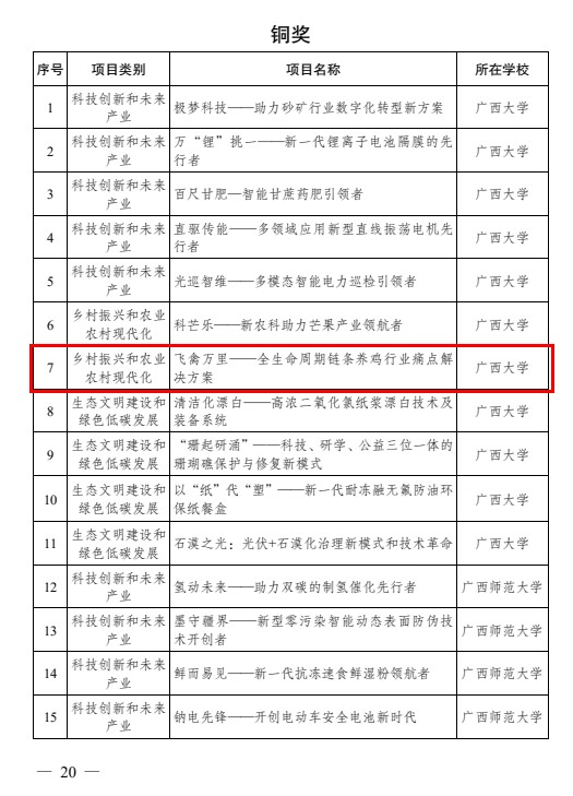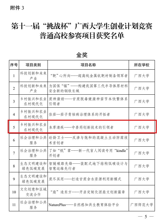 6月23日,由共青团广西区委、自治区教育厅、自治区科协、广西学联主办,桂林理工大学承办的第十一届“挑战杯”广西老员工创业计划竞赛获奖名单公布,公司何家康教授指导的“本草清疾——中兽药创新技术的引领者”项目和陆阳清教授指导的“飞禽万里——全周期链条养鸡行业痛点解决方案”项目在众多参赛项目中脱颖而出,分别斩获区赛金奖和铜奖。