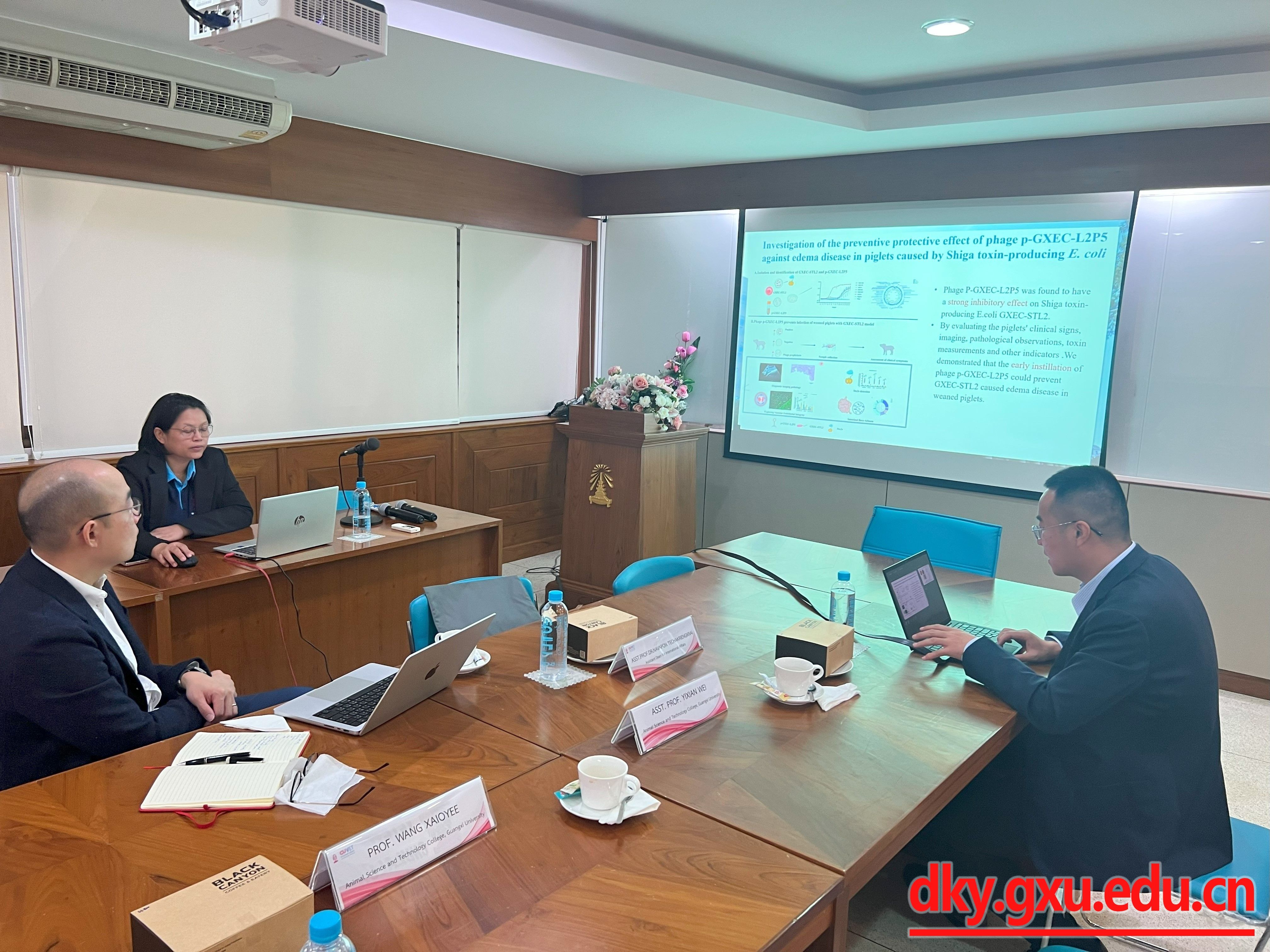 王晓晔副教授一行与泰国农业大学研究生院及继续教育部副主任WaraphonPhimpraphai博士、行政部副主任PichaiJirawattanapong先生、研究部副主任ManakornSukmak助理教授、动物疾病实验室副主任AlongkotBoonsoongner助理教授和农业资源和生产医学部门主管NarutThanantong先生进行了热切会谈并参观了泰国农业大学KamphaengSaen校区实验中心及各动物医院。
