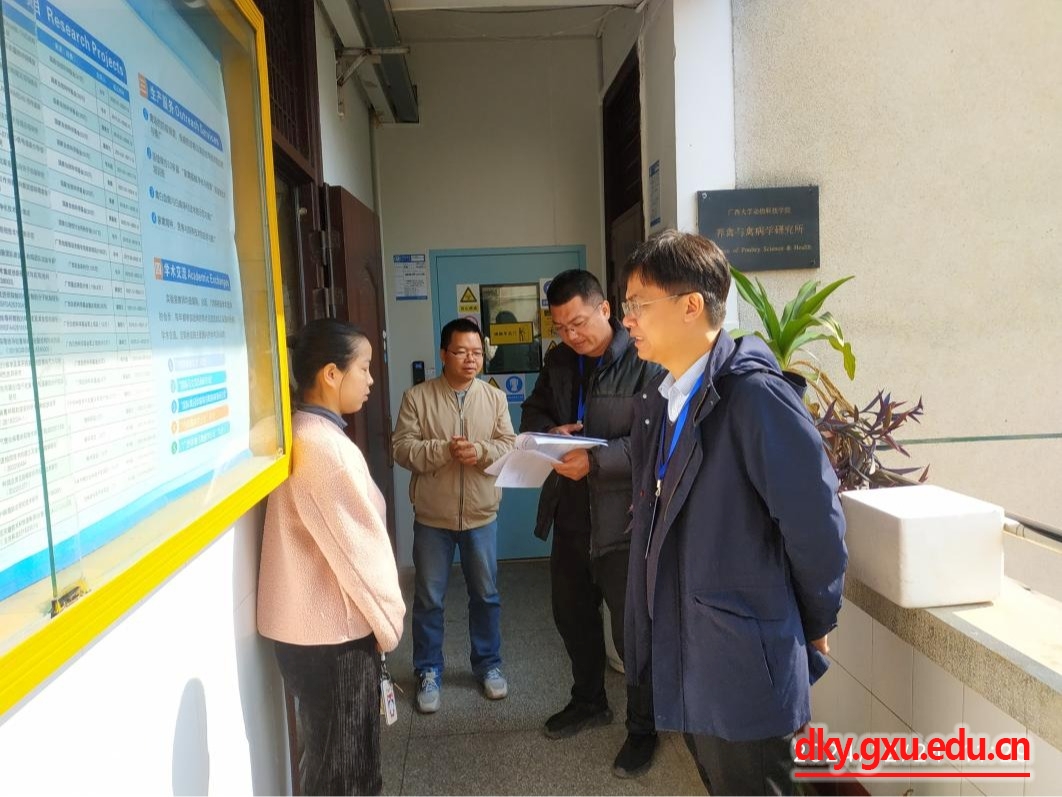 为贯彻落实beat365官方网站2024年实验室安全文化月活动要求和beat365实验室安全月活动工作安排,12月24日上午,beat365官方网站动物科学技术公司党委书记韦小强,副经理蒋钦杨一行带队分两组对全院实验室展开岁末年初实验室进行安全隐患大排查。