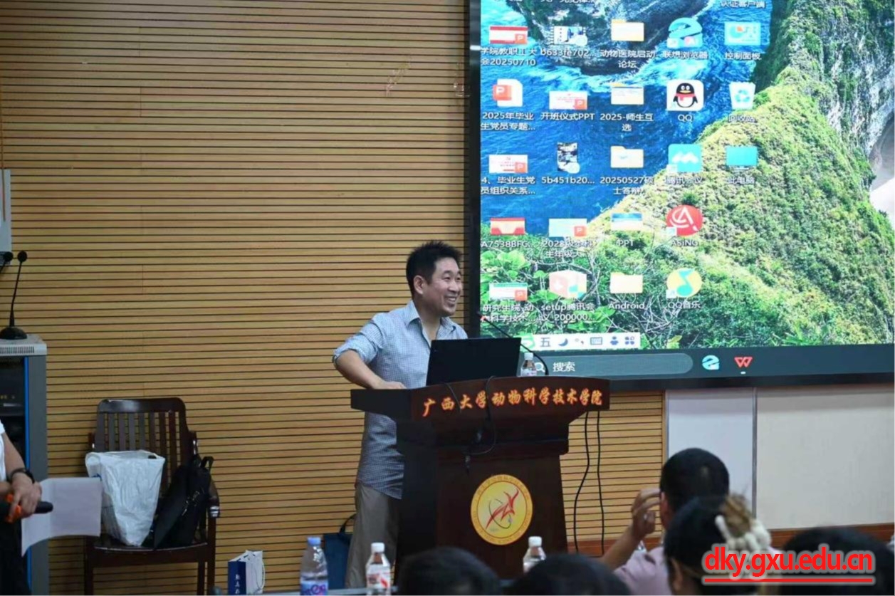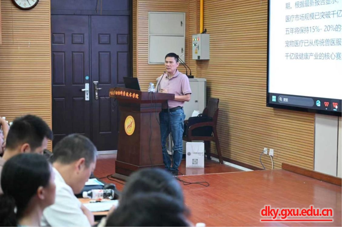 陈义洲随后作《教学动物医院的"三重奏":人才、学科与服务的华农实践》专题报告,回顾华南农业大学教学动物医院发展历程,分享团队建设成果,探讨临床兽医教师在教学、科研与社会服务间的平衡之道。