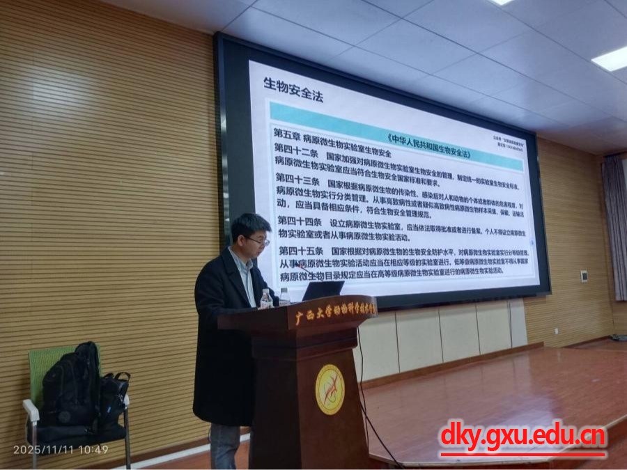 上午的生物安全培训由郭爱涛副经理主持,陆翔副处长到场并讲话,着重强调了实验室安全的重要性,尤其指出生物安全不仅关乎师生个人健康安全,更关乎公共卫生安全,全体实验人员须高度重视。