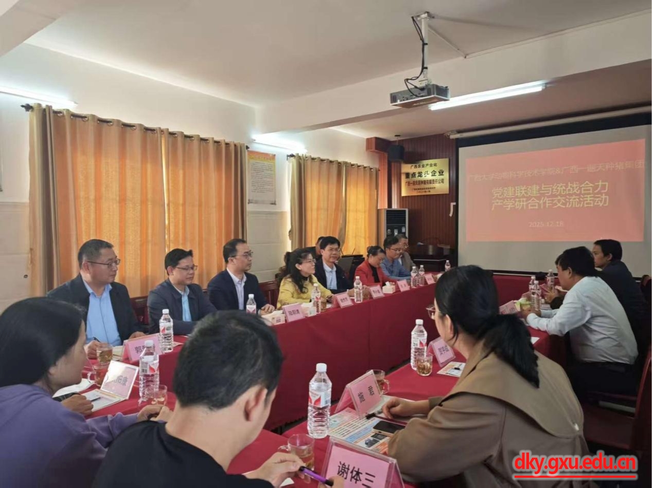 在随后的座谈交流中,广西一遍天原种猪有限责任公司总裁杨厚德介绍了企业党建与生产经营深度融合的实践经验,强调了党组织在推动技术创新、凝聚职工力量、履行社会责任中的关键作用。韦小强介绍了公司在人才培养、科学研究、社会服务等方面的基本情况,指出校企党建联建是深化产学研合作、提升服务产业能力的重要平台,希望未来双方能在科研协同与人才培养方面开展深度合作,实现共赢发展。陆阳清围绕生猪育种、健康养殖等领域的科研合作、人才培养模式创新等议题,与企业代表进行了深入探讨。