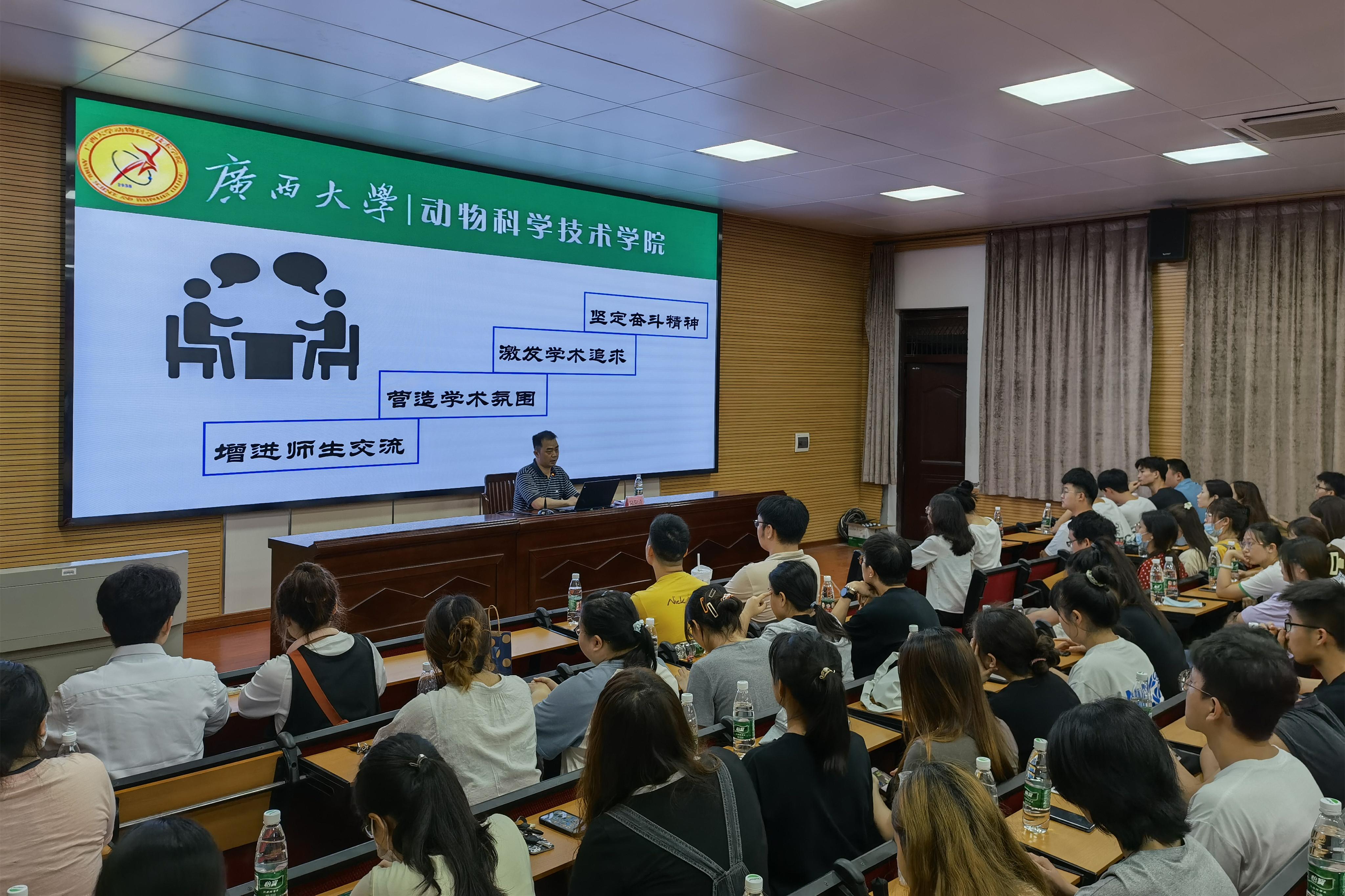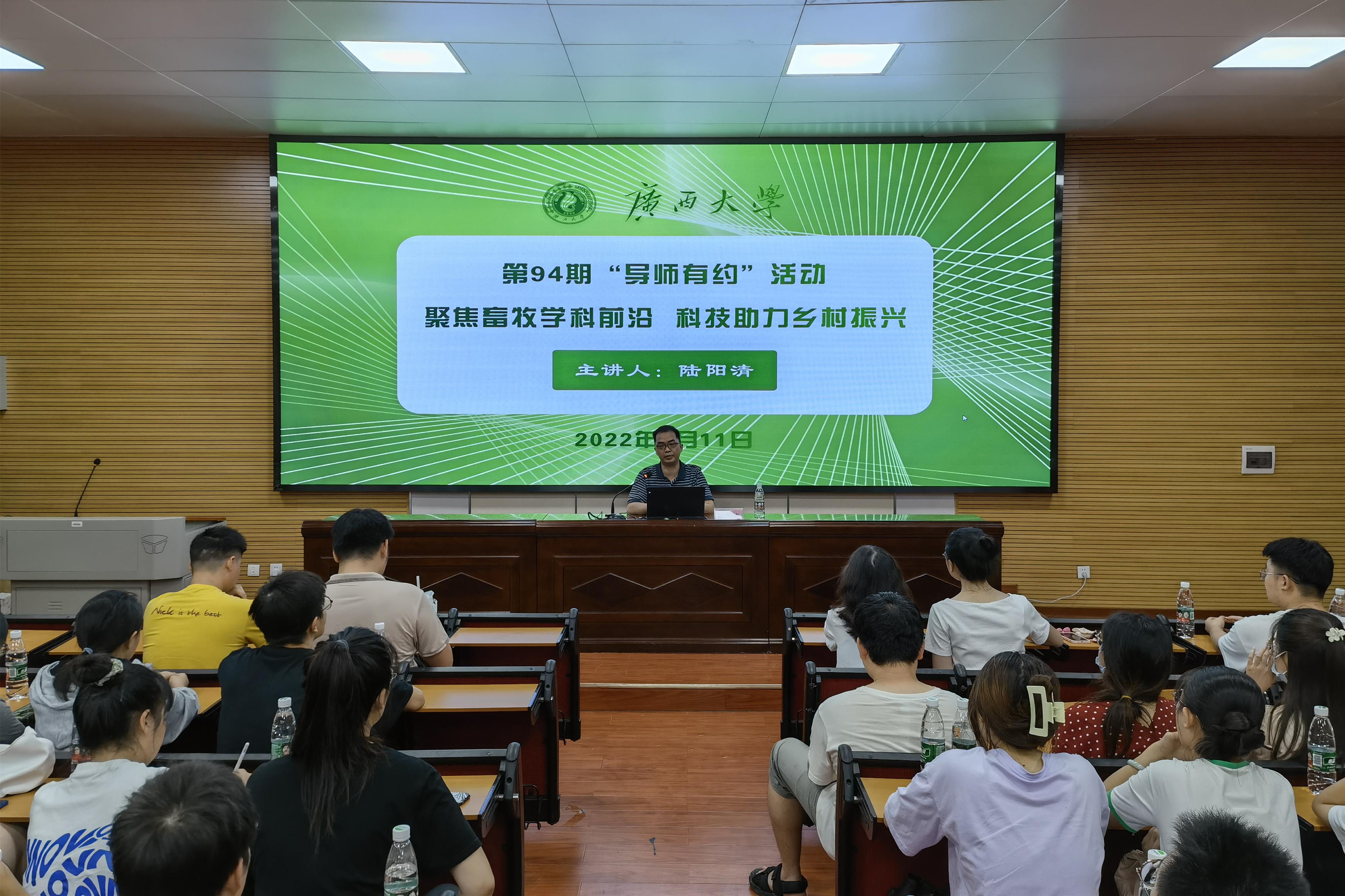 6月11日晚上,beat365官方网站第94期“导师有约”活动在beat365318报告厅举行,主题为“聚焦畜牧学科前沿,科技助力乡村振兴”,beat365常务副经理、教授、博士生导师陆阳清受邀主讲。beat365团委副书记刘诚,以及2021级畜牧学、畜牧专业全体硕士生参加此次活动。