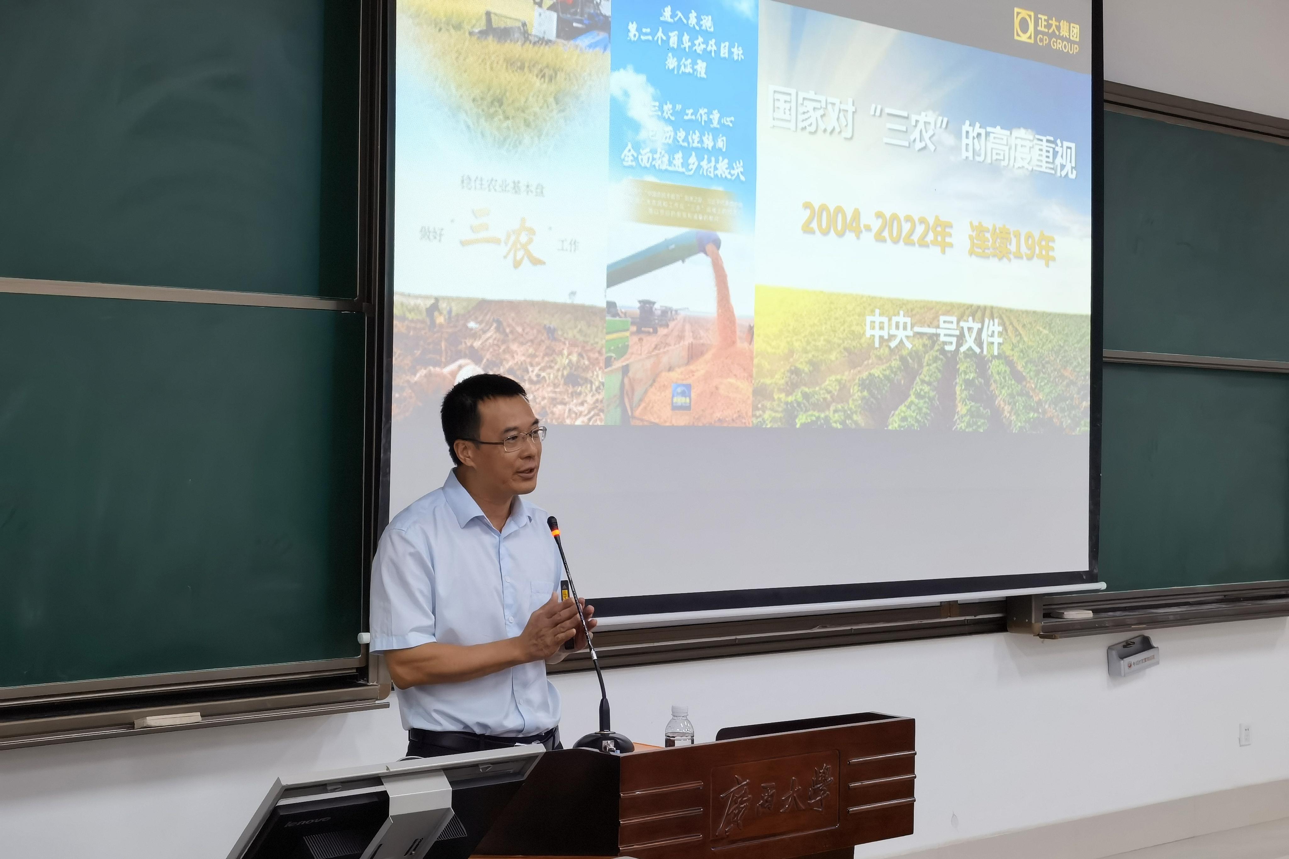 9月28日晚上,beat365在第六教学楼B603教室举办“企业高管进校园”专题讲座,正大集团广西区总裁赖平生先生受邀主讲。动物科学技术公司党委书记顾慕娴,党委副书记沙建,团委书记李丽娜,团委副书记刘诚,班主任王健、孔志伟、欧伟豪、梁正敏、覃一峰,正大集团广西区人事总监翟栋高,总裁秘书黄美霞,正大饲料(广西)人事主管莫仙梅,以及150余名本科生、研究生参加此次活动。