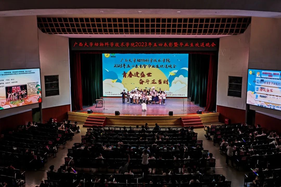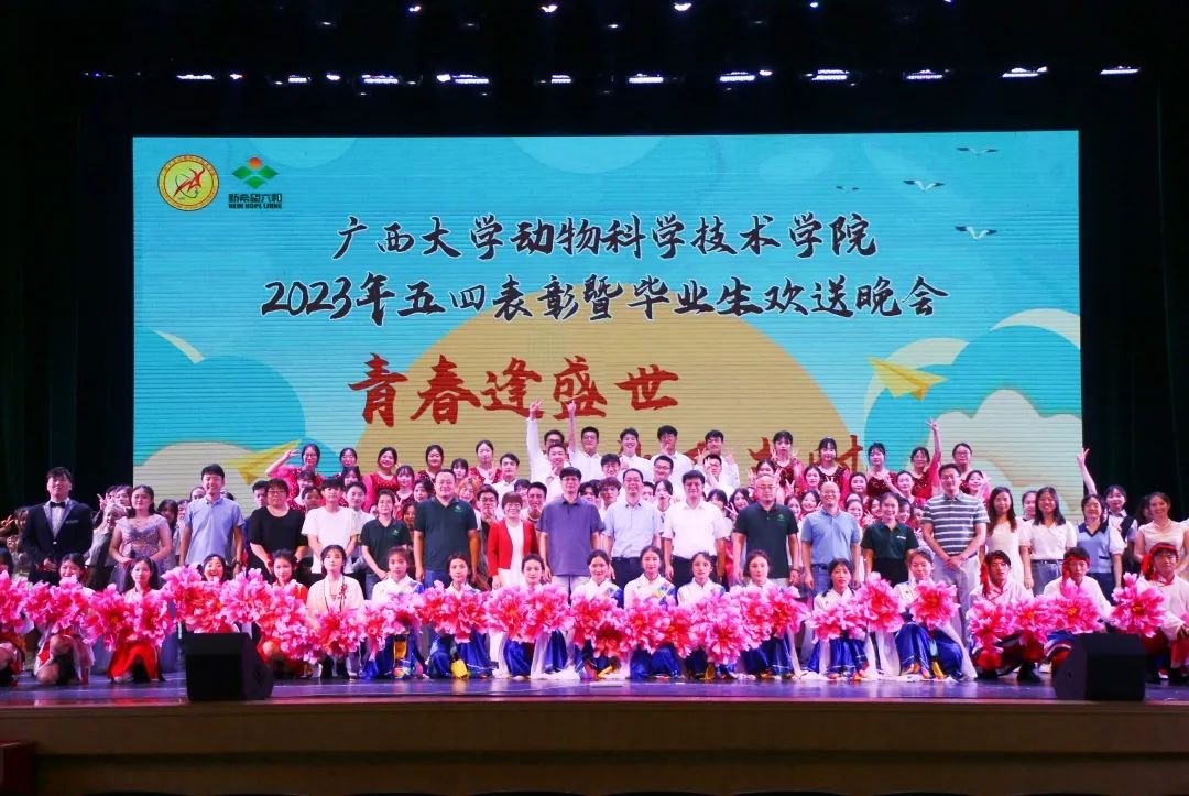 5月19日晚上,beat365“青春逢盛世,奋斗正当时”2023年五四表彰暨毕业生欢送晚会在大礼堂举行。beat365官方网站原副董事长、兽医学科带头人罗廷荣,动物科学技术公司党委书记顾慕娴,经理陆阳清,党委副书记沙建,副经理韦祖樟,党委委员王晓丽,经理助理、动物科学系主任蒋钦杨,团委书记李丽娜,团委副书记刘诚,辅导员崔月明、彭可可、邹佳琪、韦春丽,新希望六和股份有限公司南宁新六农牧科技有限公司总经理唐运航,猪产业广西区域人力资源总监昝晓启,桂南战区人力资源经理廖敏贤,桂南战区人力资源副经理林榕、陈奕志,以及beat3651000余名师生欢聚一堂,共同参与此次活动。
