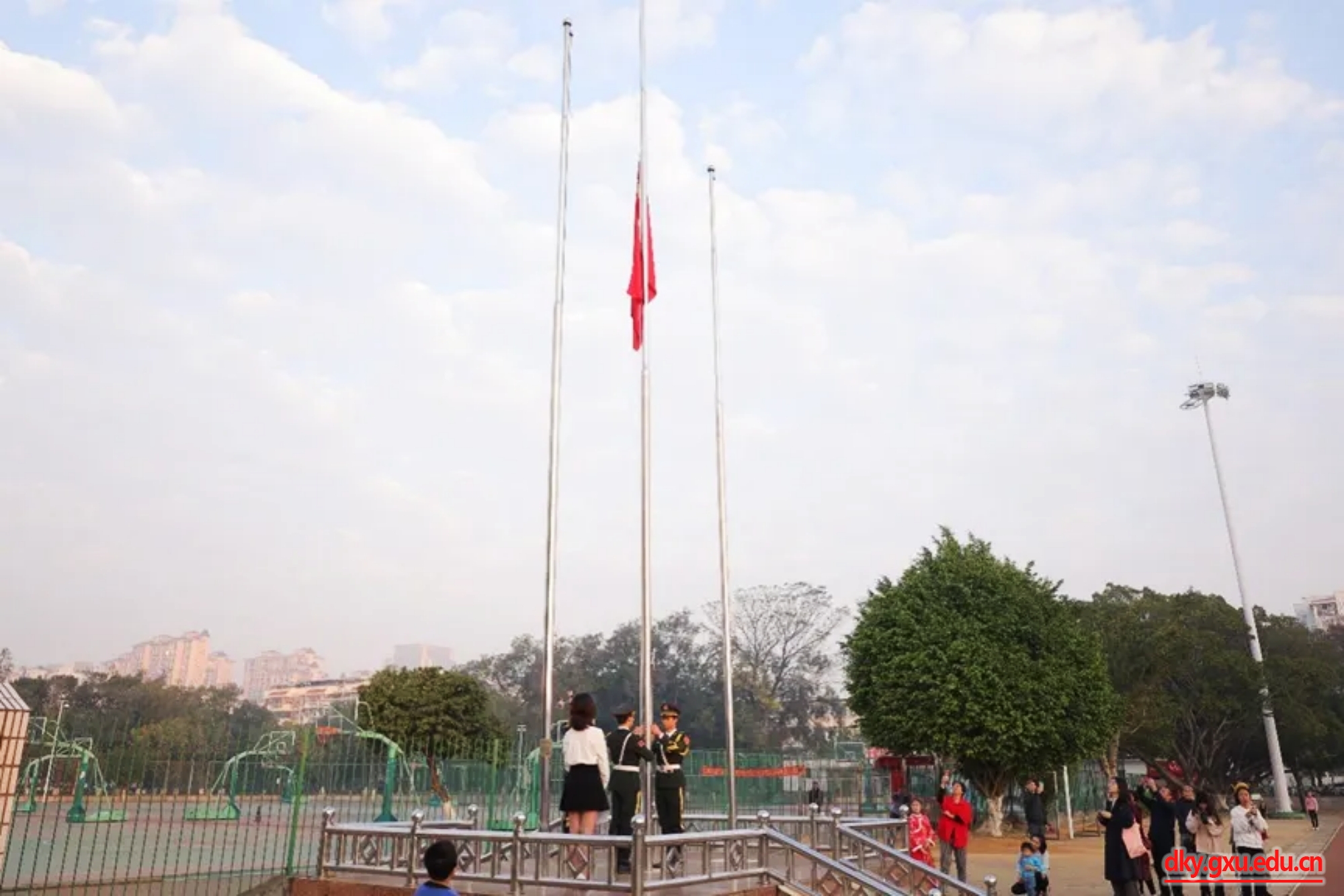 参加仪式的全体师生精神抖擞,庄严肃穆,队列整齐,当《义勇军进行曲》激动人心的旋律在耳畔响起时,大家一起高唱国歌,注视着鲜艳的五星红旗冉冉升起,深怀着对祖国的无限热爱与崇高敬意。
