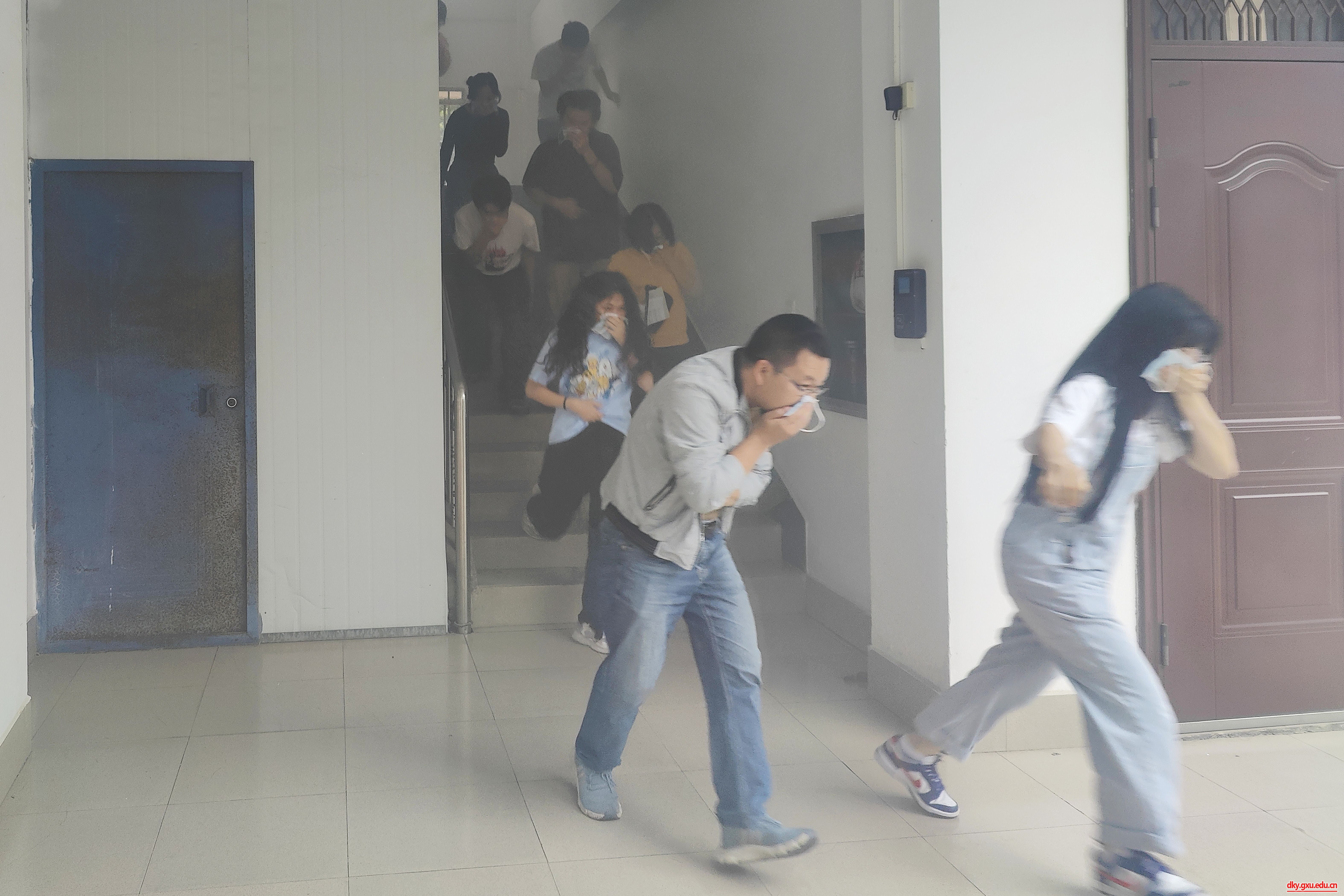 “演练开始!”模拟火场内顿时“浓烟弥漫”,参演师生纷纷弯腰低身,用湿口罩、湿毛巾等物品捂住口鼻,按照规划路线,快速、有序地撤离到安全地带。