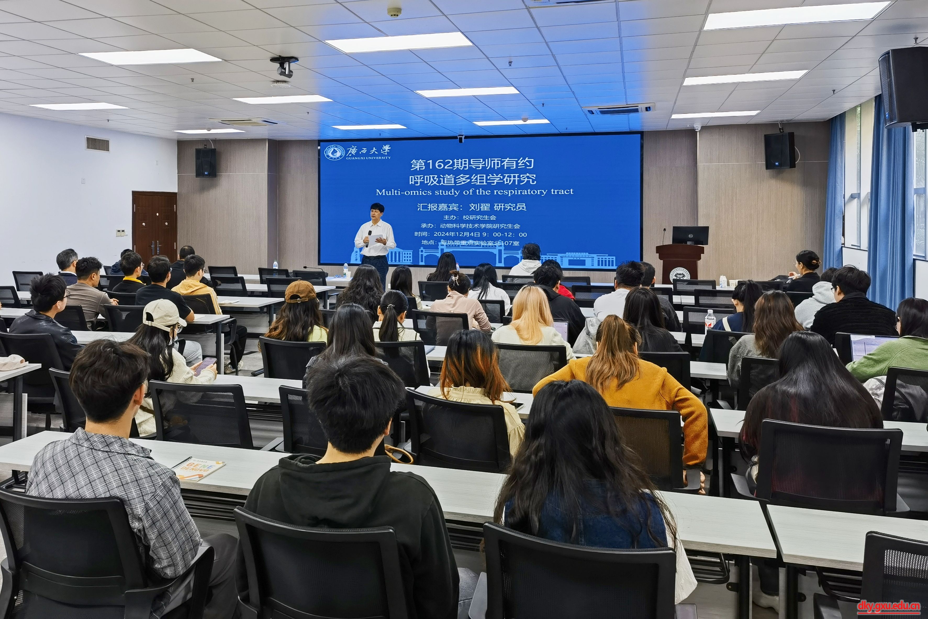 为搭建研究生与导师之间的互动平台,营造良好的学术文化交流氛围,12月4日上午,由beat365官方网站研究生会主办,beat365研究生会承办的第162期“导师有约”活动在国家重点实验室北107报告厅举行,主题为“呼吸道多组学研究”,beat365武汉病毒研究所研究员刘翟受邀主讲,100余名研究生代表现场聆听报告。活动由beat365官方网站原副董事长、兽医学科带头人罗廷荣主持。