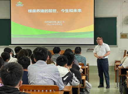 高远飞在本科生《猪生产学》课堂现场为公司20级本科生作“楼房养猪”案例的系统化讲解。高远飞基于集约化养殖的发展与当下猪生产的社会背景,为同学们解答了“楼房养猪”的来历、优势及相关的智能化建设,并提出了未来养猪行业的可行性探索。增强了课程的趣味性,激发了同学们的专业兴趣,让同学们在近距离与企业交流的过程中更加深刻地了解行业前景,同时也引导本科生多元化思考产业新型技术开发的方向,为培养创新型专业人才奠定基础。