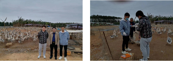 2月13日,教工二支部党员、广西肉鸽行业协会秘书长、党支部副书记韦天超副教授带领研究生到南宁市江南区郊区鹅场指导鹅病防控以及采样检测病原。