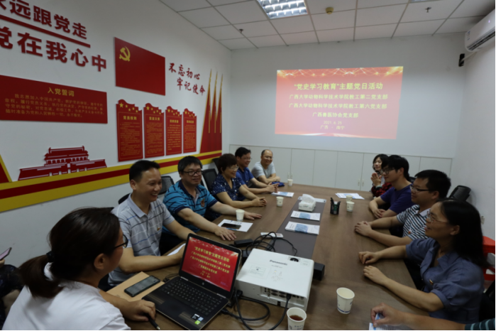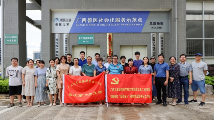 下午5:00,beat365官方网站动科院教工第二、六党支部来到广西悦牧生物公司广西兽医社会化服务示范点,与广西兽医协会党支部联合开展“党史学习教育”主题党日活动。首先是刘红云博士介绍广西兽医社会化服务基本情况,并就社会化服务中有关兽医专家库与支部各位党员进行深入交流,并热忱邀请教工第二党支部党员发挥专业特长,积极报名专家库并参加提高广西兽医技能水平各项培训。接着,顾慕娴书记给全体党员同志上了一堂生动翔实的党课,顾书记指出,脱贫攻坚取得全面胜利是中国共产党对全国人民作出的庄严承诺,具有里程碑式的意义,通过党史学习教育,培养更多“知农、爱农”专业人才,加强院企合作,参与解决行业发展面临的困境,助力提升我区乃至全国畜牧业的竞争力。