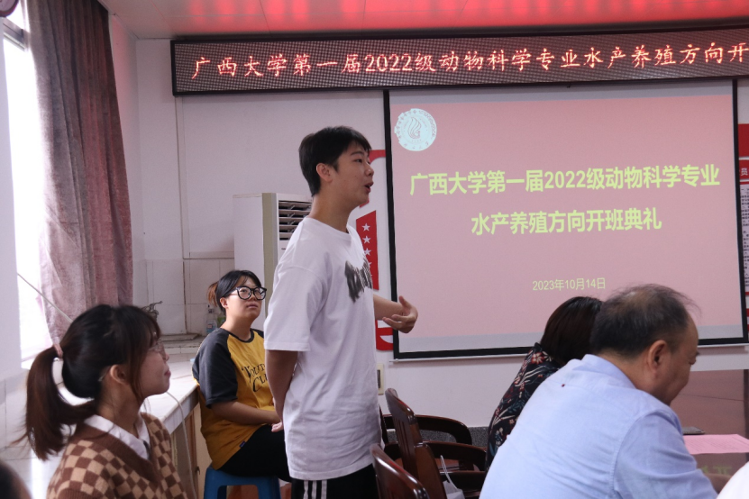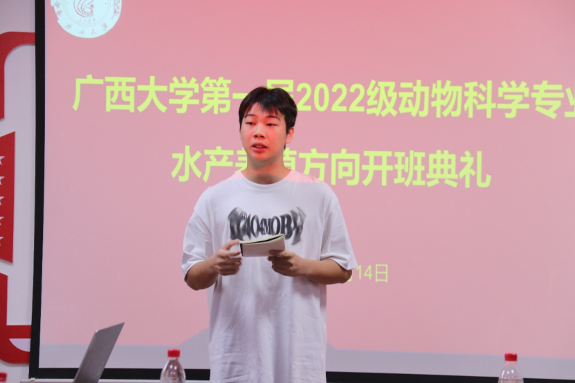 开班典礼伊始,陆阳清经理对动物科学专业水产养殖方向班成功开班表示祝贺。随后,陆经理表示,广西拥有较长的海岸线且毗邻东盟,同时地处亚热带地区,不论是地理位置还是气候上,都很适合发展水产业。陆经理直言水产养殖方向班犹如新起之火苗,希望水产方向班的同学多做出成果,带动水产学科发展。