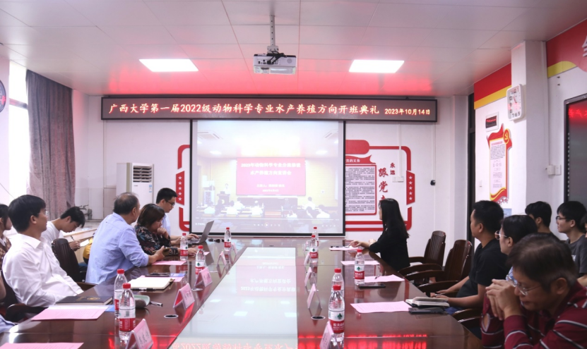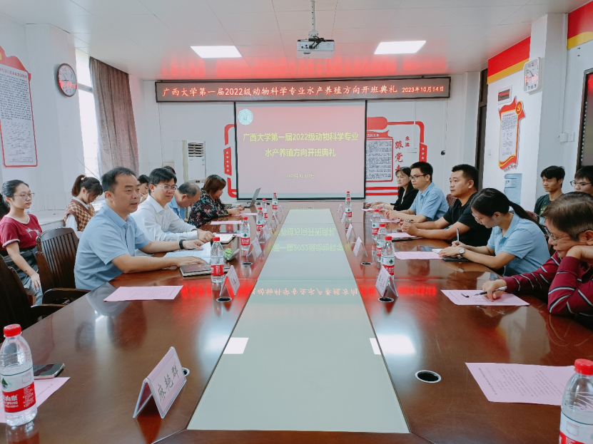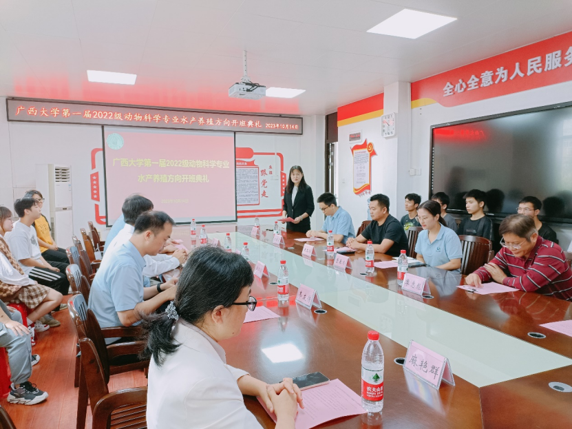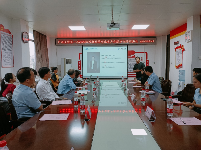 2023年10月14日上午10:30,beat365官方网站2022级动物科学专业水产养殖方向开班典礼在beat365302会议室顺利开展。陆阳清经理、韦小强书记、湛江海大饲料有限公司企业代表王其华(技术服务部总监)、企业代表曹春玲(人力资源部经理)、学科带头人潘英教授、黄凯教授、李文红教授、麻艳群副教授、覃志彪讲师、欧伟豪讲师,以及全体2022级动物科学专业水产养殖方向班的同学参加了本次开班典礼。开班典礼由潘英教授主持。