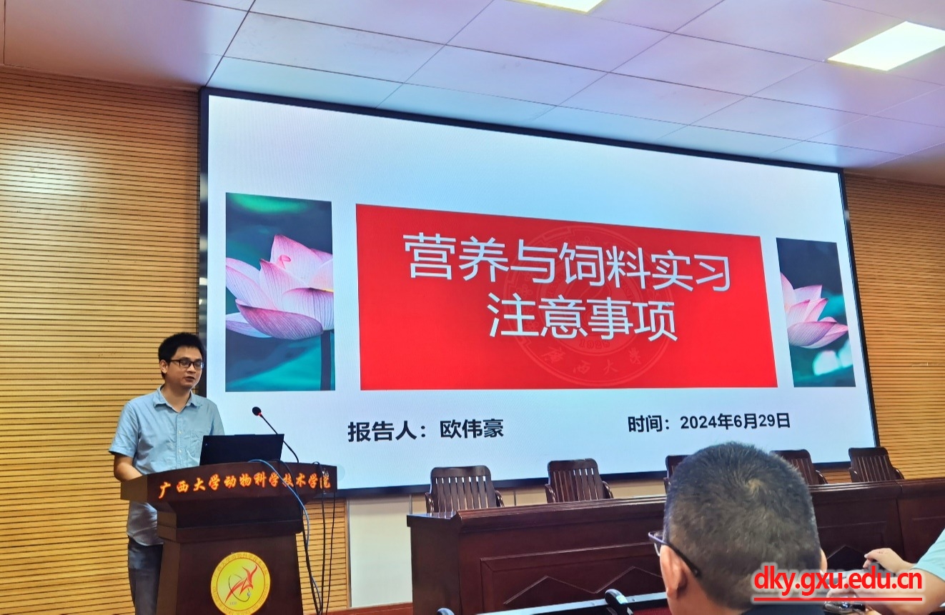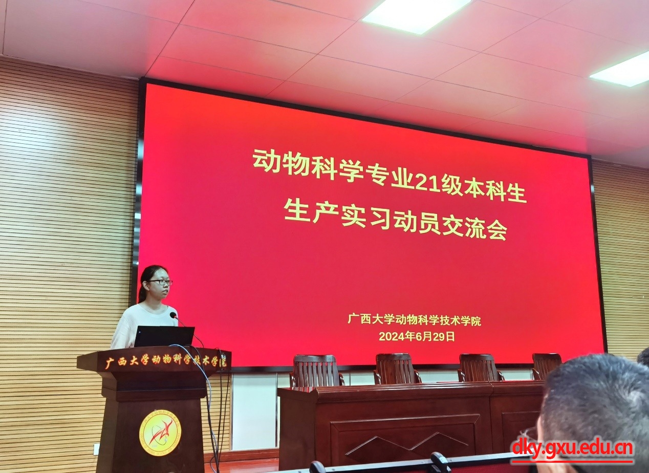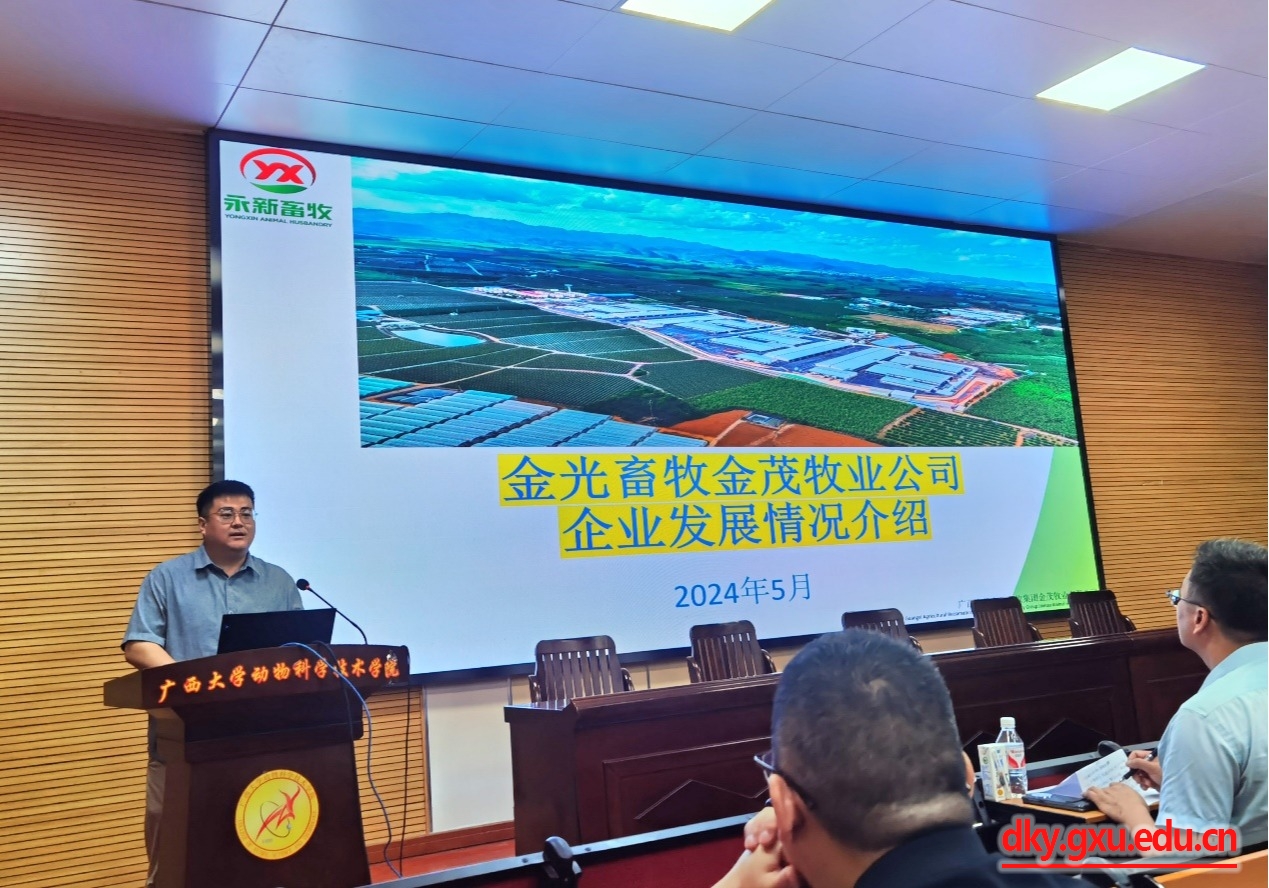 在会议中,陆阳清经理首先对生产实习做简单介绍,表达对企业的感激和对员工的勉励。金光畜牧有限公司副总经理马啸宇简单介绍了企业文化、猪场设计与运营和员工住宿等,牧原集团股份有限公司(广西)人力资源部经理李同坤介绍了公司的先进管理理念、先进技术和员工晋升等,广西新天地农牧集团有限公司人力资源部经理谢小兰介绍了公司的基本情况并表达了对实习生的勉励,广西石埠乳业有限责任公司生态观光牧场运营主管张男吉介绍了牧场的基本情况及员工生活和住宿等。班主任代表欧伟豪和林波两位老师强调了饲料生产和牛生产实习过程中的安全问题,动科系主任李辉副教授简单介绍了生产实习的方案及注意事项。最后,蒋钦杨副经理对本次会议进行总结,再次感谢企业为员工提供实习的岗位。