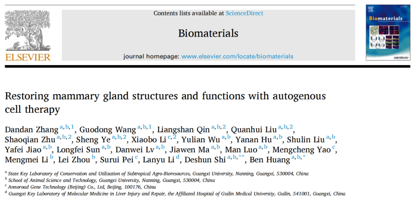 2021年8月,国际著名学术期刊《生物材料》(Biomaterials, 中科院一区Top 期刊,IF=12.479)在线发表黄奔研究员团队完成题为“通过自体细胞治疗的方法修复乳腺组织结构和功能”(Restoring mammary gland structures and functions with autogenous cell therapy) 的研究论文。该团队首次发现单一小分子化合物(RepSox)能够诱导山羊耳部成纤维细胞重编程为具有泌乳功能的化学诱导乳腺上皮细胞(CiMECs),同时研究结果表明这些CiMECs具有与山羊乳腺上皮细胞高度相似的生物学特性以及基因表达模式。进一步的单细胞转录组测序,蛋白组学和代谢组学以及基因功能验证等实验阐明TGFβ Receptor 1基因的表达下调引起下游SMAD3基因表达上调,从而诱导山羊成纤维细胞逆转回到胚胎外胚层样状态(Embryonic Ectoderm-like),逃脱成纤维细胞特异性基因表达程序,进而建立乳腺上皮细胞特异性基因表达程序。另外,诱导乳腺上皮细胞(CiMECs)能够在体内形成具有泌乳功能的正常乳腺组织结构的能力,提示其修复乳腺组织结构和功能的作用。