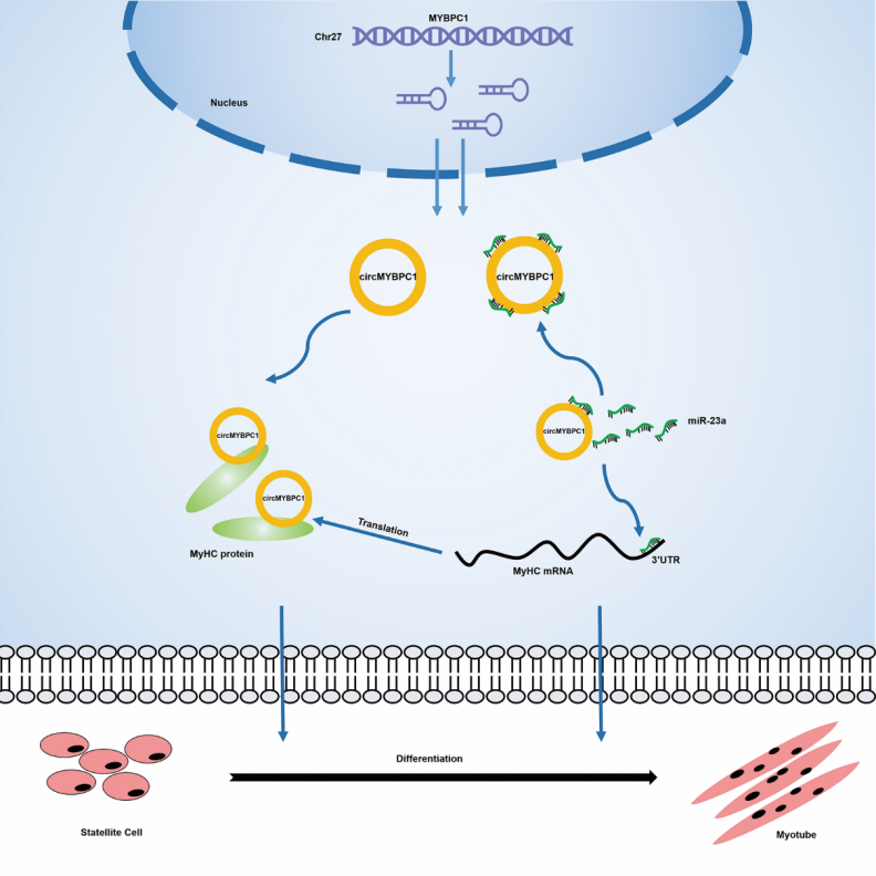 探究circRNA和miRNA调控肌肉发育的作用机制是当前肉牛繁育的研究热点。本团队首次以广西本地沼泽型水牛为研究对象,以不同发育时期的水牛肌肉样本为研究对象,采用RNA-Seq技术对其进行circRNA测序,发现新非编码RNA-circRNA0007120在成年时期肌肉中高表达,该circRNA全长398 nt,采用RNA-FISH技术发现主要定位于成肌细胞细胞质,在发育过程中随着分化逐渐高表达。提示该转录本可能与成肌细胞分化有关,该circRNA来源于肌凝蛋白结合蛋白基因MYBPC1, 因此将其命名为circMYBPC1, 进一步通过RIP、RNA pull down等技术探索circMYBPC1与miRNA、mRNA、RBP(RNA Binding Protein)形成机制及功能验证,结果表明:circMYBPC1可以通过吸附miR-23a,减弱miR-23a对MyHC基因表达的抑制作用,circMYBPC1可以结合MyHC蛋白,进而增强水牛成肌细胞分化作用;最终小鼠肌损伤实验表明,circMYBPC1还可能促进肌再生机制的发生,最终提出circMYBPC1调控水牛肌肉发育的调控分子机制模型。