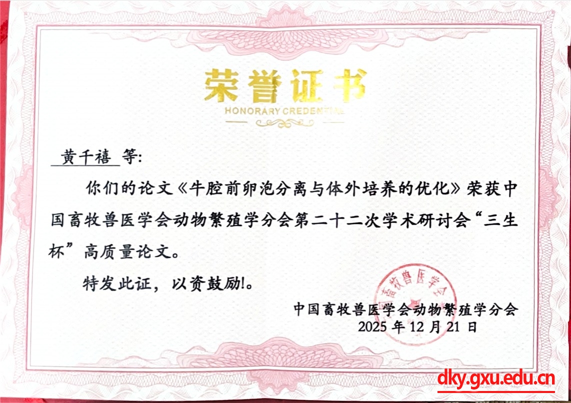 本次研讨会以“促进动物繁殖理论与技术创新,推动产业高质量发展”为主题,汇集了繁殖领域基础研究、前沿技术探索以及产业发展的最新进展和成果。会议交流内容包括特邀报告、青年学者论坛、论文摘要以及墙报。公司五名硕士研究生(黄千禧、吴毓滢、刘李、冯瑶、杨星)在青年学者论坛分别就腔前卵泡的体外培养、卵泡闭锁和黄体形成、母胎互作机制和早期妊娠诊断等新进展进行了口头汇报。此外,黄千禧同学还荣获了本届会议的“三生杯”高质量论文奖。