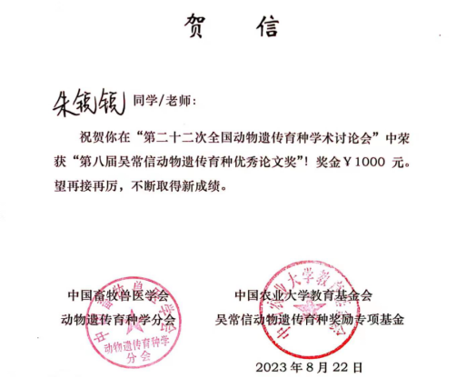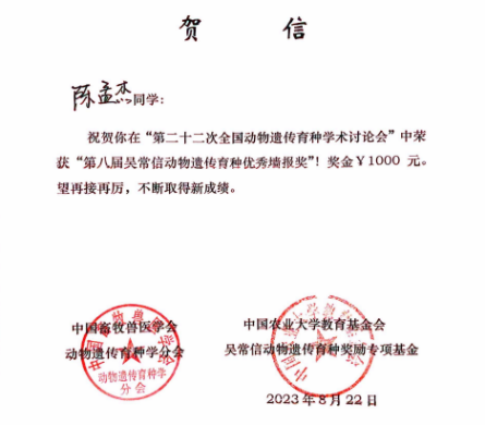 第二十二次全国动物遗传育种学术讨论会是我国动物遗传育种领域进行学术交流的一个优秀平台。此次大会以“BT+IT驱动种业振兴”为主题,汇集了猪遗传育种、家禽遗传育种技术、草食动物遗传育种技术、基因组选择与统计基因组、家禽基因编辑、基因组组装与功能解析、微生物组与畜禽遗传育种等方向的最新科研成果。交流方式包括主会场特邀报告、分会场报告以及墙报。公司博士研究生张叁保(导师:蒋钦杨)、陈孟杰(导师:石德顺、李辉)、陈亚玲(导师:李湘萍、李辉)、朱锐锐(导师:黄洁萍)分别做了口头汇报和墙报,其中,张叁保和朱锐锐口头汇报荣获优秀论文奖,陈孟杰荣获青年学者旅行奖和优秀墙报奖。通过参加本次学术讨论会,大家学习了动物遗传育种学领域的最新科研成果、研究动态与趋势,这有助于梳理和扩展研究思路,更好地规划未来的研究方向。