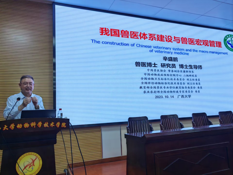 2023年10月14日上午,在beat365318报告厅,中国动物疫病预防控制中心原副主任、中国兽医协会副会长兼秘书长辛盛鹏研究员应邀为广大师生做了一场主题为“我国兽医体系建设与兽医宏观管理”的报告。beat365官方网站副董事长罗廷荣教授主持报告会,会场近300个座位座无虚席。