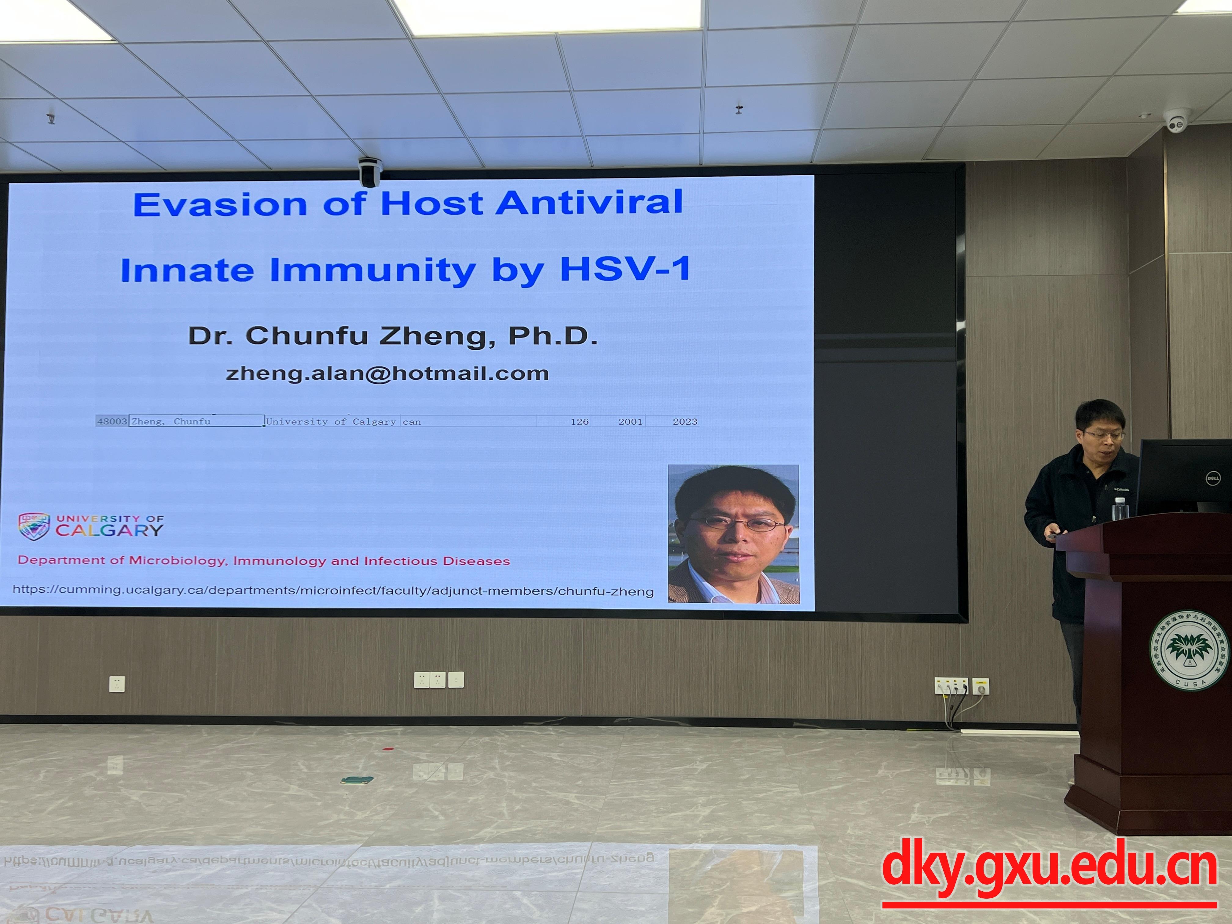 12月22日上午,加拿大卡尔加里大学郑春福教授在beat365官方网站国家重点实验室107会议室作题为 “Evasion of host antiviral innate immunity by HSV-1”的学术报告。报告会由beat365副经理韦祖樟教授主持,beat365磨美兰教授、韦天超副教授、欧长波副教授等教师以及100多名师生参加报告会。